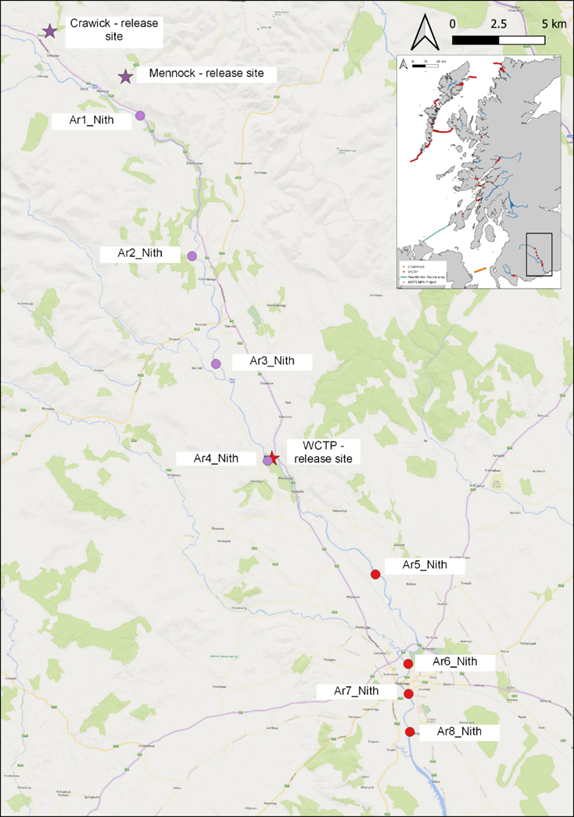 In 2021, the Nith Catchment Fishery Trust ran a project called the Nith Salmon Smolt Tracking Project. The project entailed trapping 50 salmon smolts from the Upper Nith, in the Crawick and Mennock Waters, and fitting them with acoustic tags. Eight acoustic receivers were positioned down the length of the River Nith which meant that the salmon smolts could be tracked as they migrated downstream and out into the Solway. (Fig. 1)